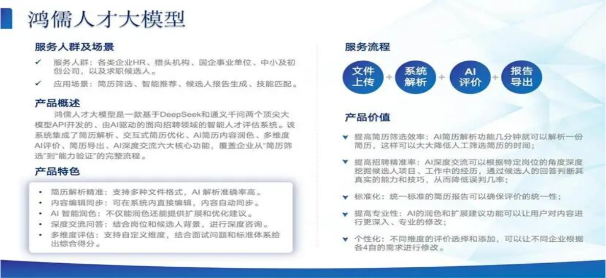 “鸿儒人才大模型”基于 DeepSeek 与通义千问两大顶尖大模型API开发,以AI驱动重构招聘全流程,集成简历解析、交互式简历优化、AI内容润色、多维度AI评价、简历导出、AI深度交流六大核心功能,可精准模拟不同岗位面试场景,支持企业自定义评价标准,有效降低招聘筛选成本,提升人才评估客观性,实现前沿技术与人力服务场景的深度融合。