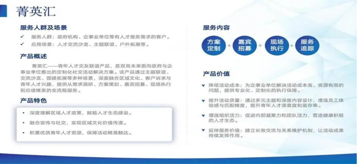 “菁英汇”—青年人才交友联谊产品,是一套面向政府与企事业单位推出的定制化人才交流活动解决方案。该产品以“人才联谊+文化融合”为核心,通过主题联谊、交流沙龙、团建拓展等多元场景,深度整合区域文化特色、客户核心诉求与青年人才兴趣偏好,提供从需求调研、方案策划、嘉宾招募、现场执行业务到后续维系的全链条服务,既为青年人才搭建社交桥梁,也为客户单位打造长效人才服务机制。