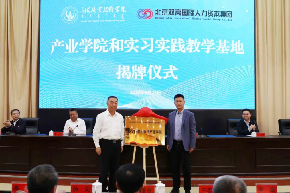 2025年9月24日,北京双高国际人力资本集团有限公司与乌海职业技术学院合作办学签约暨揭牌仪式在乌海市举行。双高集团党委副书记、董事、总经理王荣森与乌海职业技术学院党委书记乔天峰共同为共建产业学院揭牌,标志着双方在产教融合、共育技术技能人才方面开展全面合作。